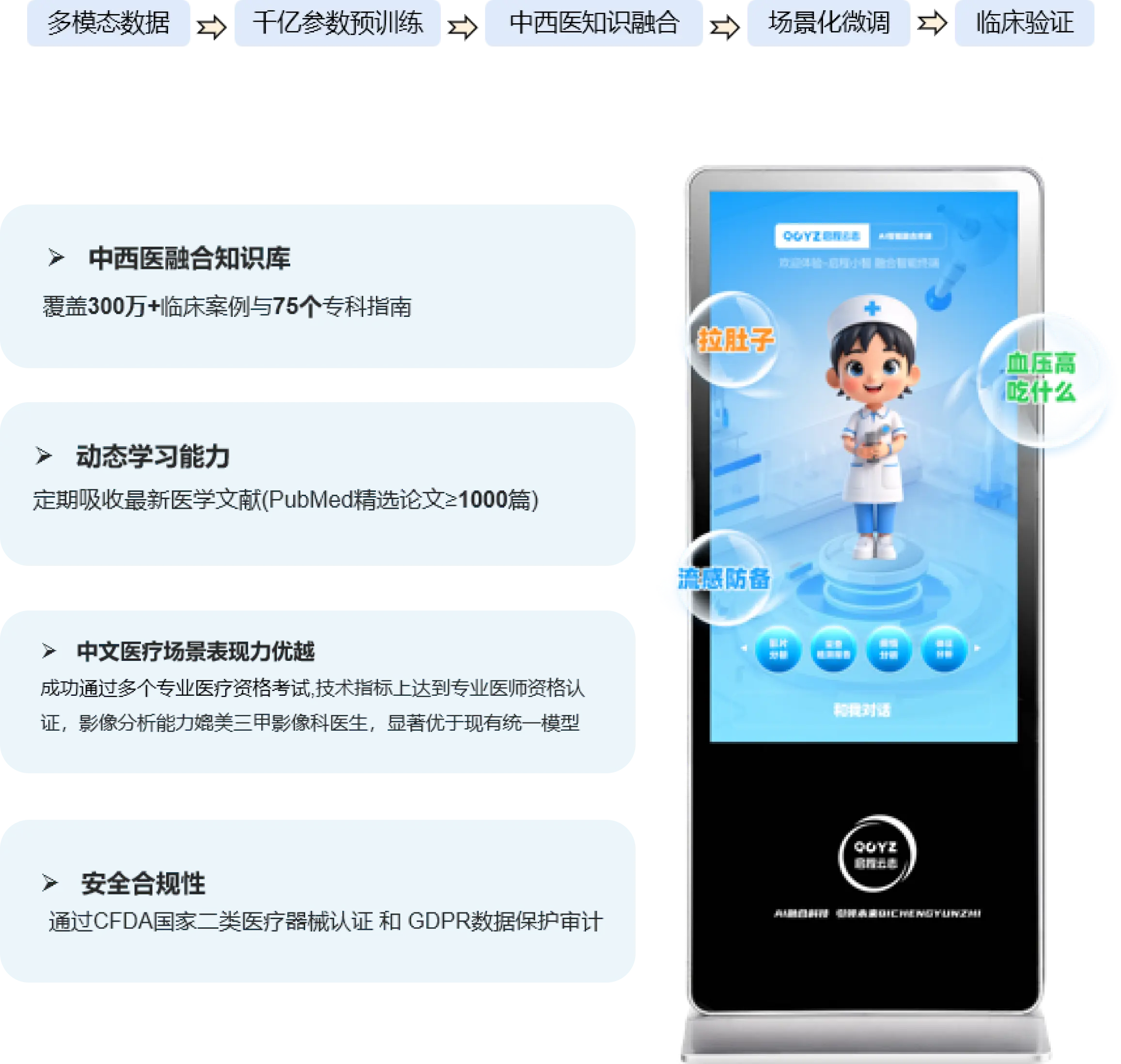 “AI+硬件设备+数据”的一体化解决方案,让基层医疗更智能、更高效 功能全面:功能完备度高,是国内第一台深度整合多模态数据、全医疗场景服务的智能终端设备 技术领先:融合中西医知识库、千亿级参数预训练、通过多个专业医疗资格考试、动态学习能力领先行业 全流程覆盖:从药店分诊到医院影像分析到定制化医疗方案,贯穿“诊前-诊中-诊后”全流程